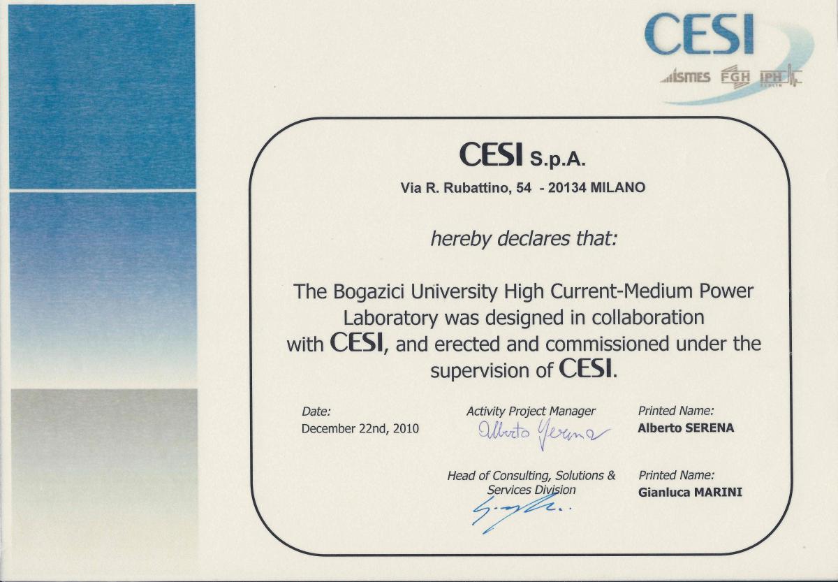 2010 yılı Mayıs ayı içinde; AG termik manyetik şalter, dağıtım panosu, güç trafosu, busbar, orta gerilim atrıcısı, AG sigortası gibi malzemelerin, kısa devre dayanım testleri CESI'den gelen uzmanları eşliğinde deneme amacıyla yapılmıştır. Bundan sonra ki zamanda, üretici firmaların, ürünlerinin ilgli standartlara göre çeşitli kısa devre testleri ve tüm çalışmlar, laboratuvar ekibi tarafından yürütülmeye başlamıştır.